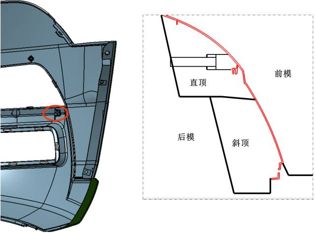 在汽車注塑模具中,針對汽車保險杠產品,模具設計時通常會采用先進的內分型麵技術。其優點是分型夾線隱藏在保險杠的非外觀麵上,在汽車上裝配後看不到外觀夾線,不會影響產品外觀。但這種技術在難度與結構上都要比外分型保險杠複雜,技術風險也較高,模具成本與模具價格也會高於外分型保險杠很多,但因外觀美觀,在中高檔汽車中被廣泛應用。