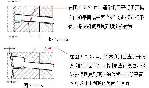 在斜頂機構中,為了保證斜頂工作穩定、可靠,應該注意以下幾點:(A)斜頂的剛性。增強斜頂剛性一般采用:1.在結構允許的情況下,盡量加大斜頂橫斷麵尺寸。(參見第七章7.2節)2.在可以滿足側向出模的情況下,斜頂的斜度角“A”盡量選用較小角度,斜角A一般不大於20°,並且將斜頂的側向受力點下移,如增加圖7.7.1a中的鑲塊2,同時鑲塊可以具有較高的硬度,提高 模具 的壽命。(B)斜頂橫向移動空間。如圖7.7.1a所示尺寸“D”,為了保證斜頂在頂出時不與膠件上的其它結構發生幹涉,應充分考慮斜頂的側向分模距離、斜頂的斜度角“A”,以保證有足夠的橫向移動空間“D”。(C)斜頂在開模方向的複位。為了保證合模後,斜頂回複到預定的位置,一般采用下麵的結構形式。如圖7.7.2a;7.7.2b。
