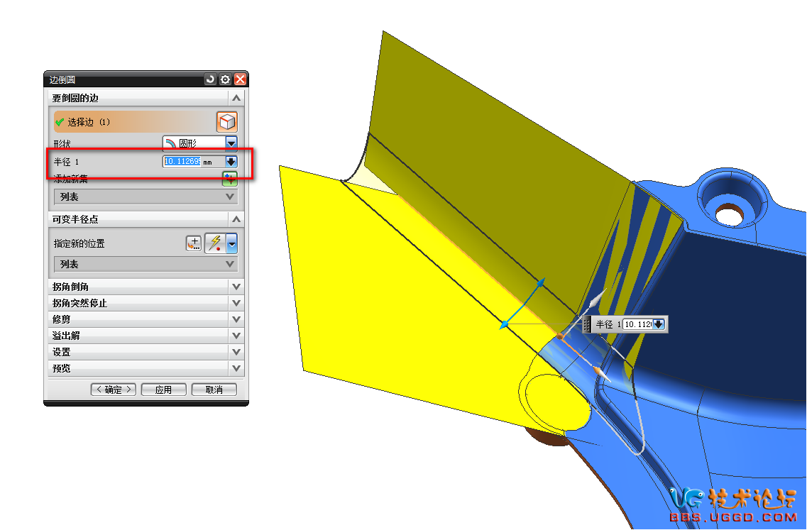 3.用“幾何屬性”命令測量兩個麵之間的R角是多少,並且將R角的數據複製下來,然後用“邊倒圓”命令將R角倒上,粘貼R角的數據到半徑1對話框中,確定