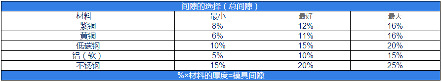 間隙的選擇(總間隙)材料最小最好最大紫銅8%12%16%黃銅6%11%16%低碳鋼10%15%20%鋁(軟)5%10%15%不鏽鋼15%20%25%%×材料的厚度=模具間隙