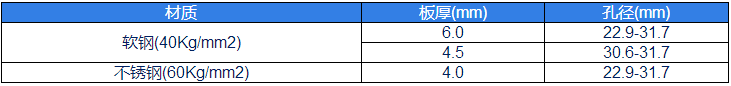 材質板厚(mm)孔徑(mm)軟鋼(40Kg/mm2)6.022.9-31.74.530.6-31.7不鏽鋼(60Kg/mm2)4.022.9-31.7